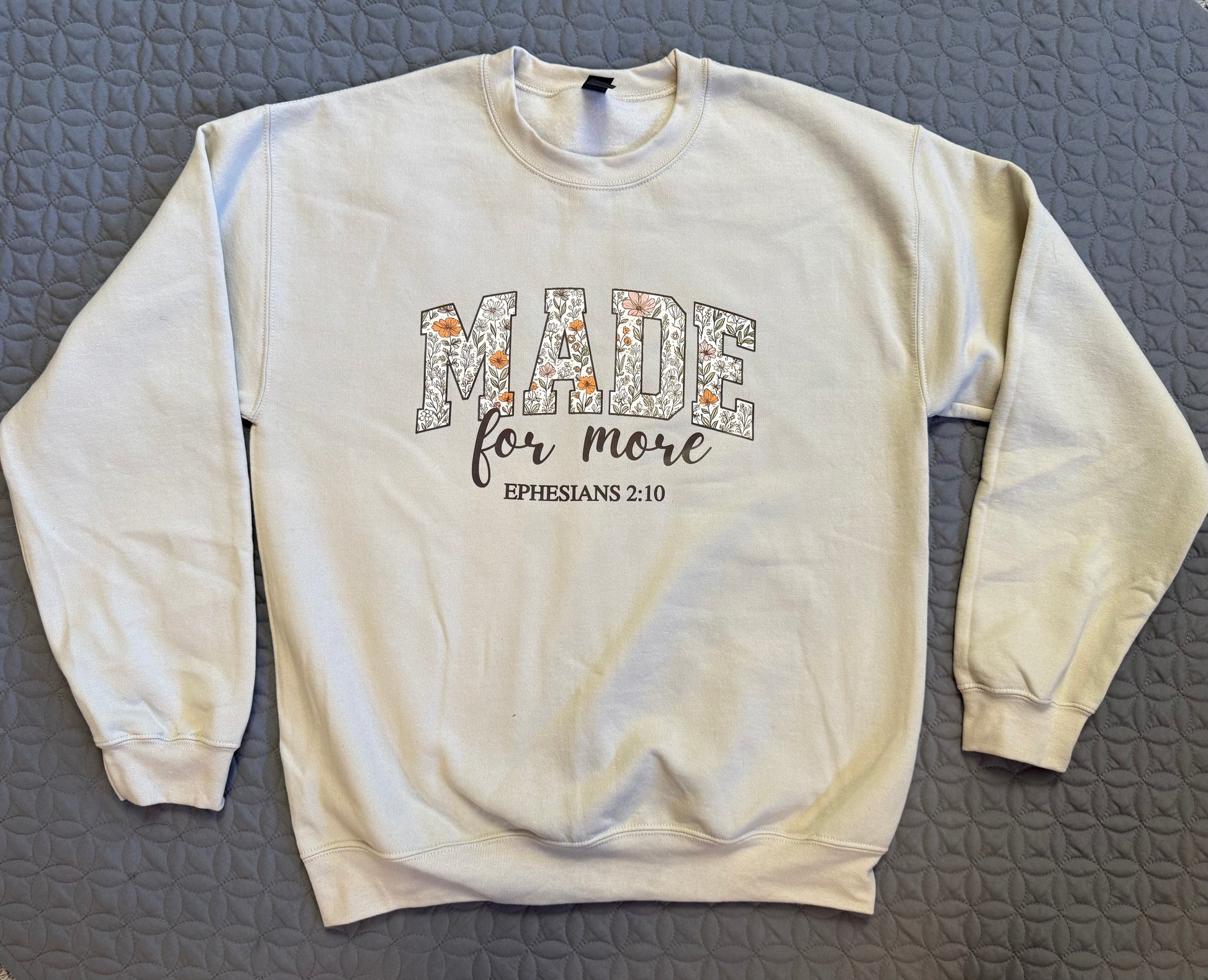 Discover our "Made for More" crew neck sweater, crafted on a soft Gildan 50/50 cotton and polyester blend for a comfortable fit true to size.